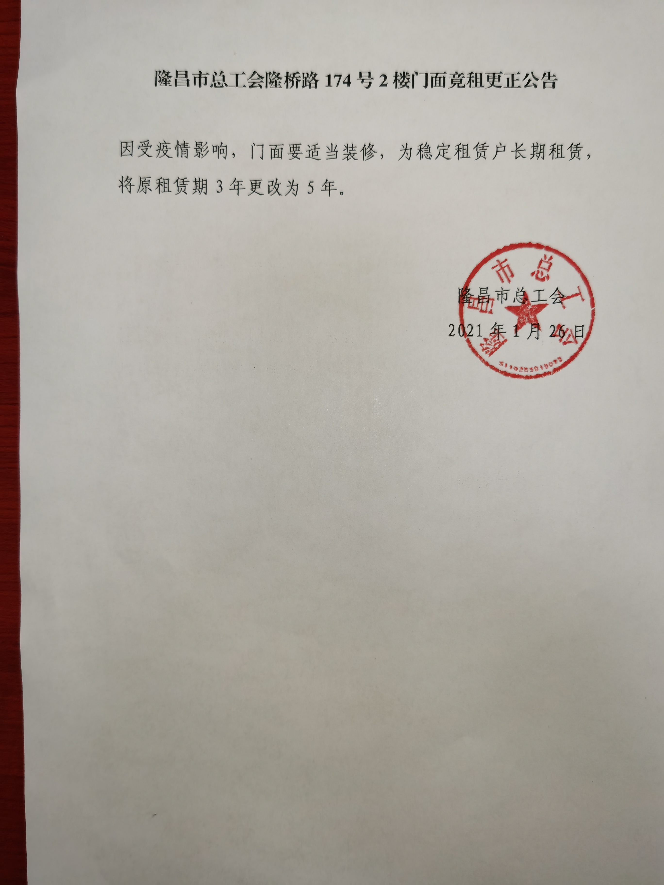 隆昌市总工会隆桥路174号2楼门面竞租更正公告
