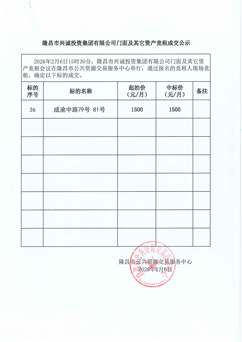 LCJY(2026)C009隆昌市兴诚投资集团有限公司门面及其它资产竞租成交公告