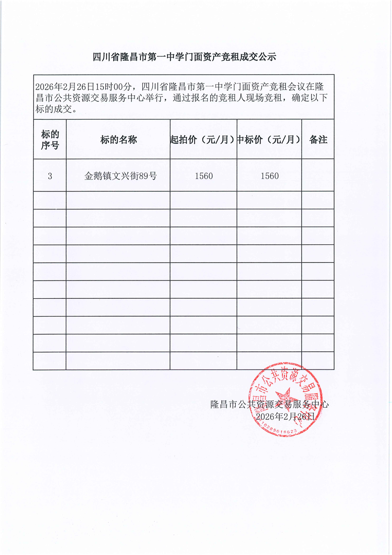 LCJY(2026)C014隆昌一中门面资产租赁成交公告