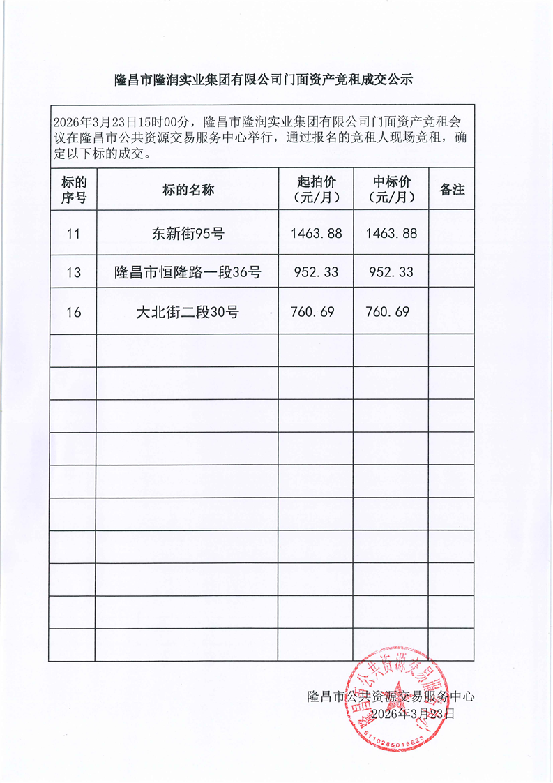 LCJY(2026)C024隆昌市隆润实业集团有限公司门面资产竞租成交公告