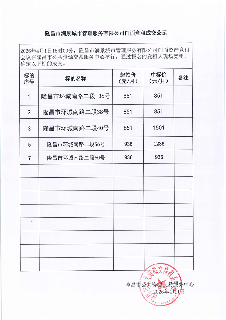 LCJY(2026)C026隆昌市润景城市管理服务有限公司门面资产租赁成交公告