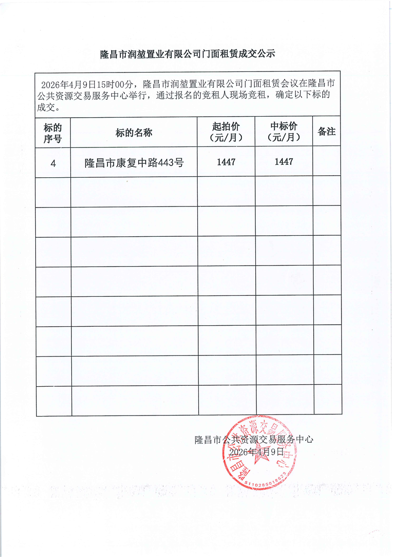 LCJY(2026)C031隆昌市润堃置业有限公司门面租赁成交公告