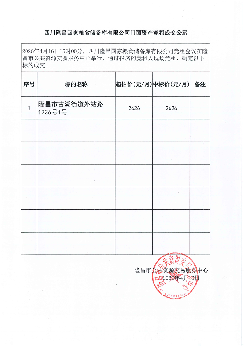 LCJY(2026)C035四川隆昌国家粮食储备库有限公司门面竞租成交公告