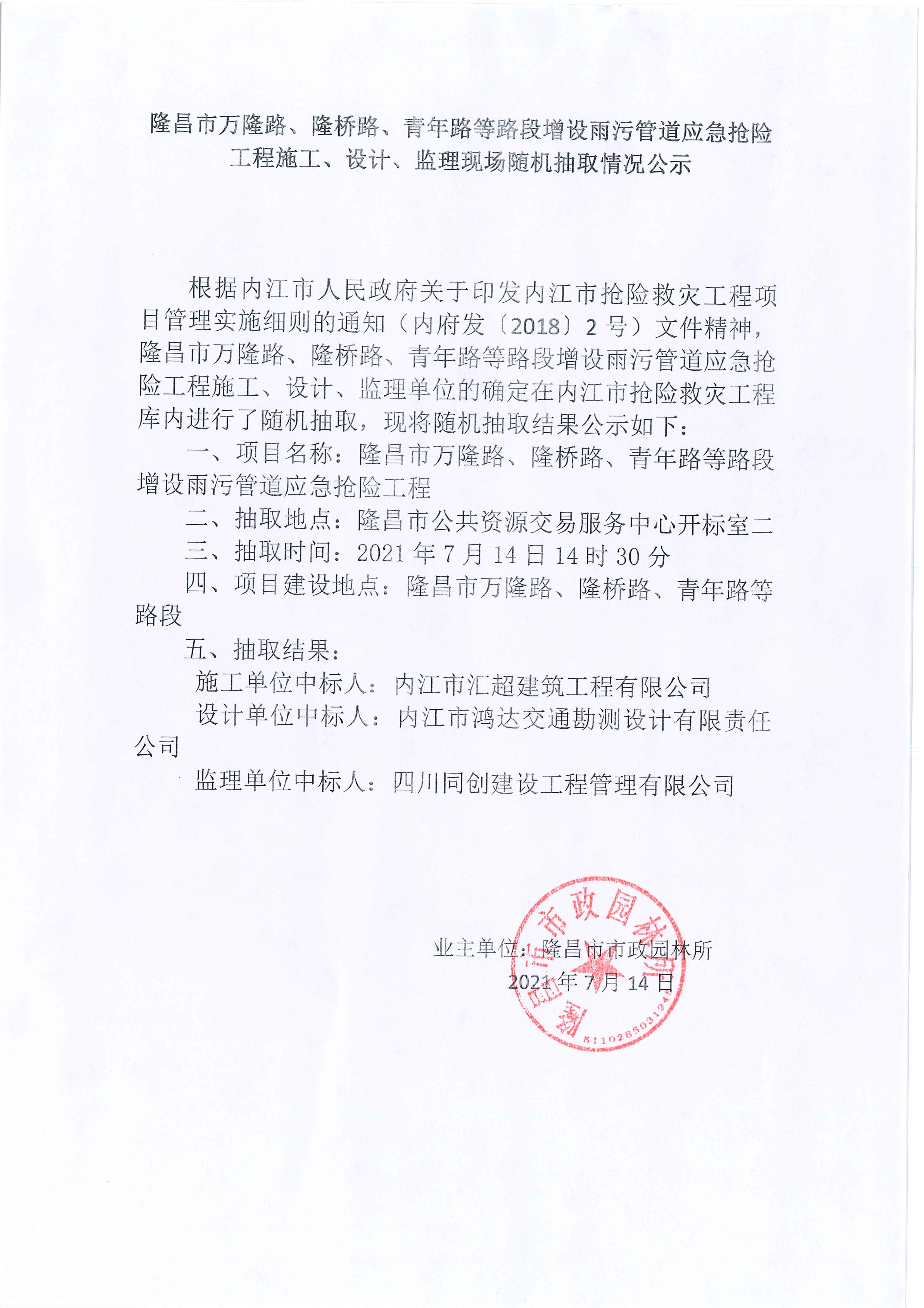 隆昌市万隆路、隆桥路、青年路等路段增设雨污管道应急抢险工程施工、设计、监理现场随机抽取情况公示