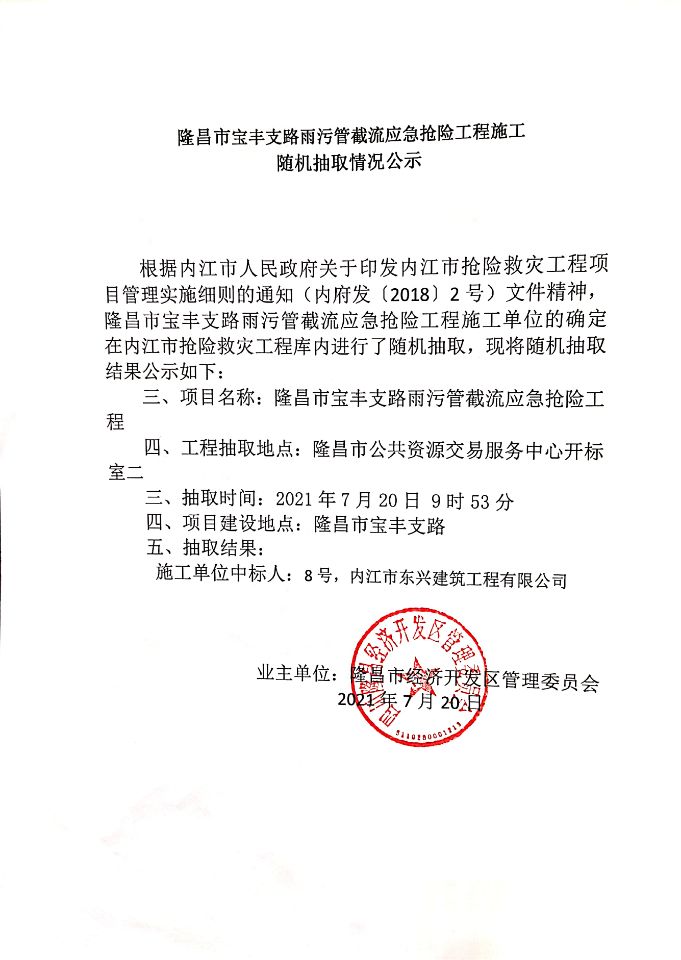 隆昌市宝丰支路雨污管截流应急抢险工程施工随机抽取情况公示