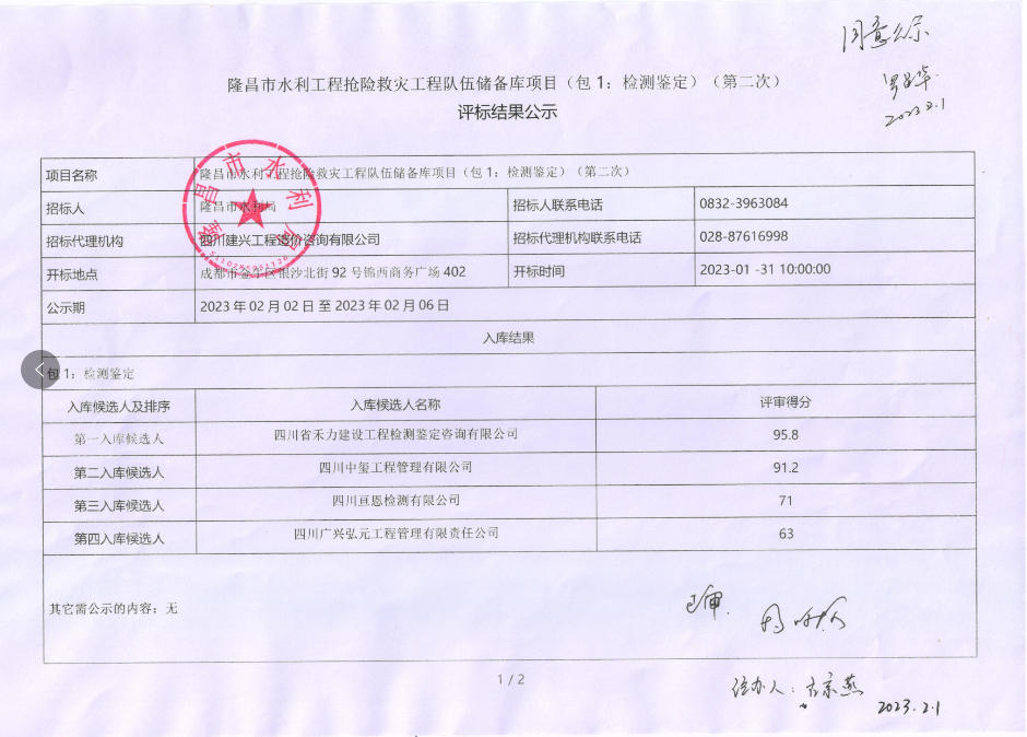 隆昌市水利工程抢险救灾工程队伍储备库项目 (包 1:检测鉴定) (第二次) 评标结果公示