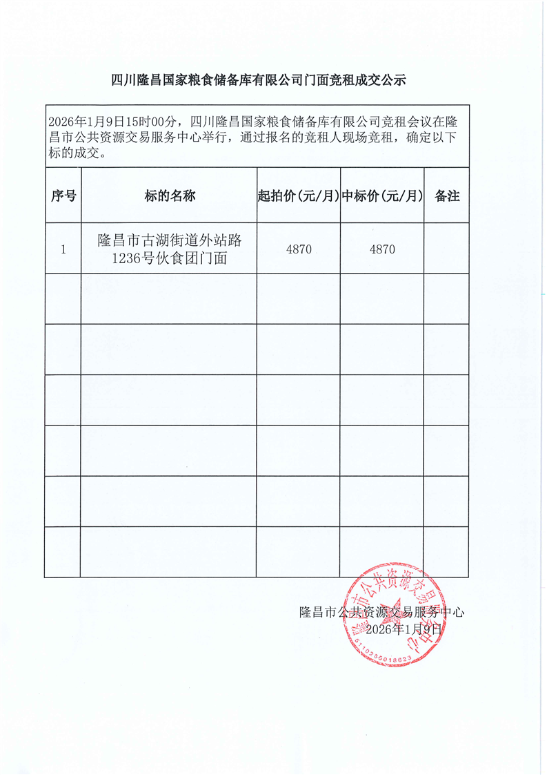 LCJY(2025)C093四川隆昌国家粮食储备库有限公司门面资产竞租成交公告