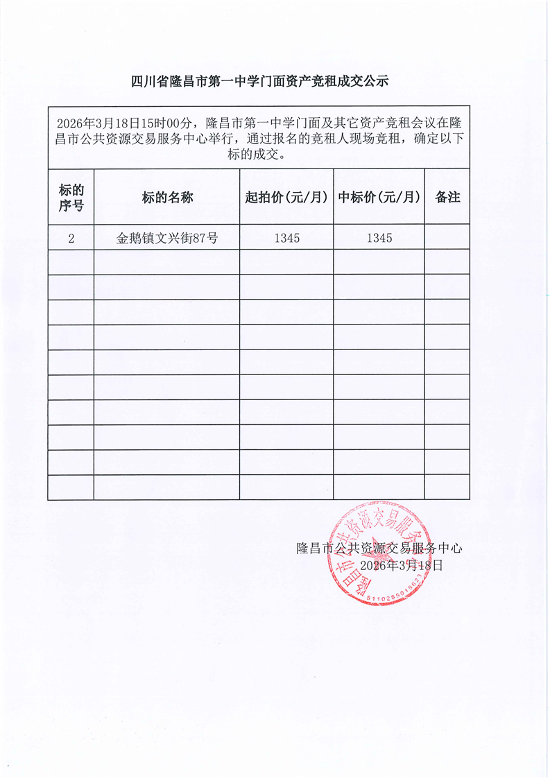 LCJY(2026)C022四川省隆昌市第一中学门面资产竞租成交公告