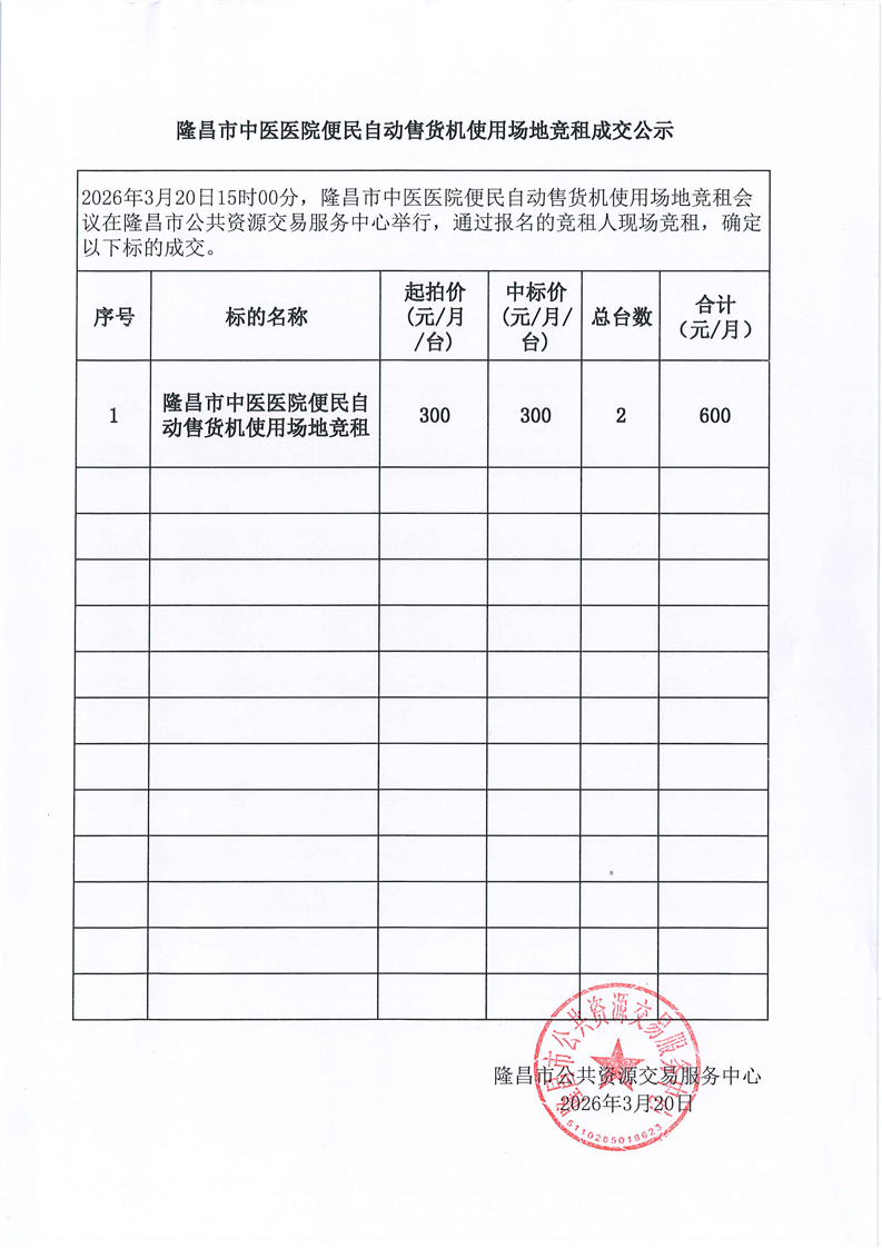 LCJY(2026)C021隆昌市中医医院便民售货柜使用场地竞租成交公告