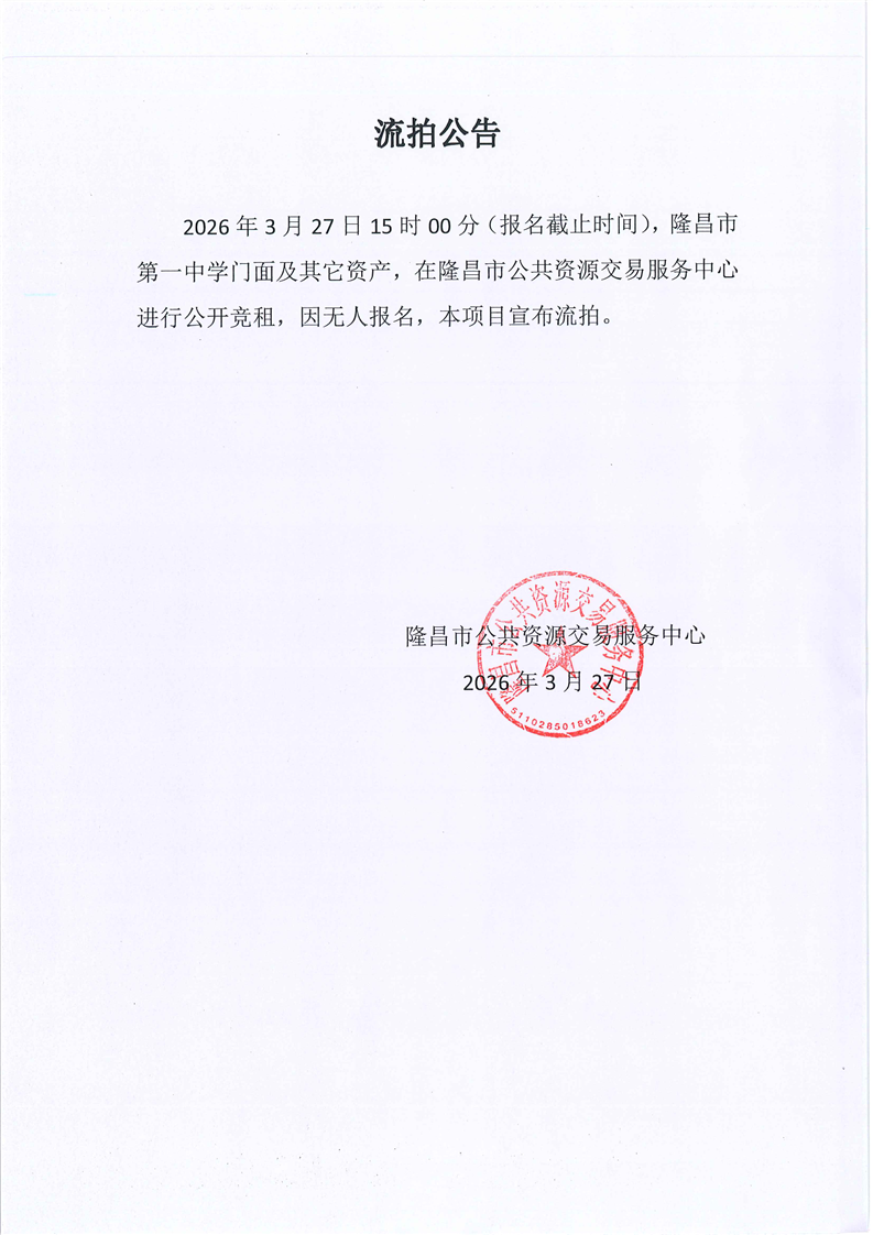 LCJY(2026)C027隆昌一中门面资产租赁流拍公告