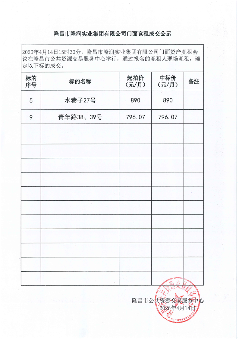 LCJY(2026)C033隆昌市隆润实业集团有限公司门面竞租成交公告